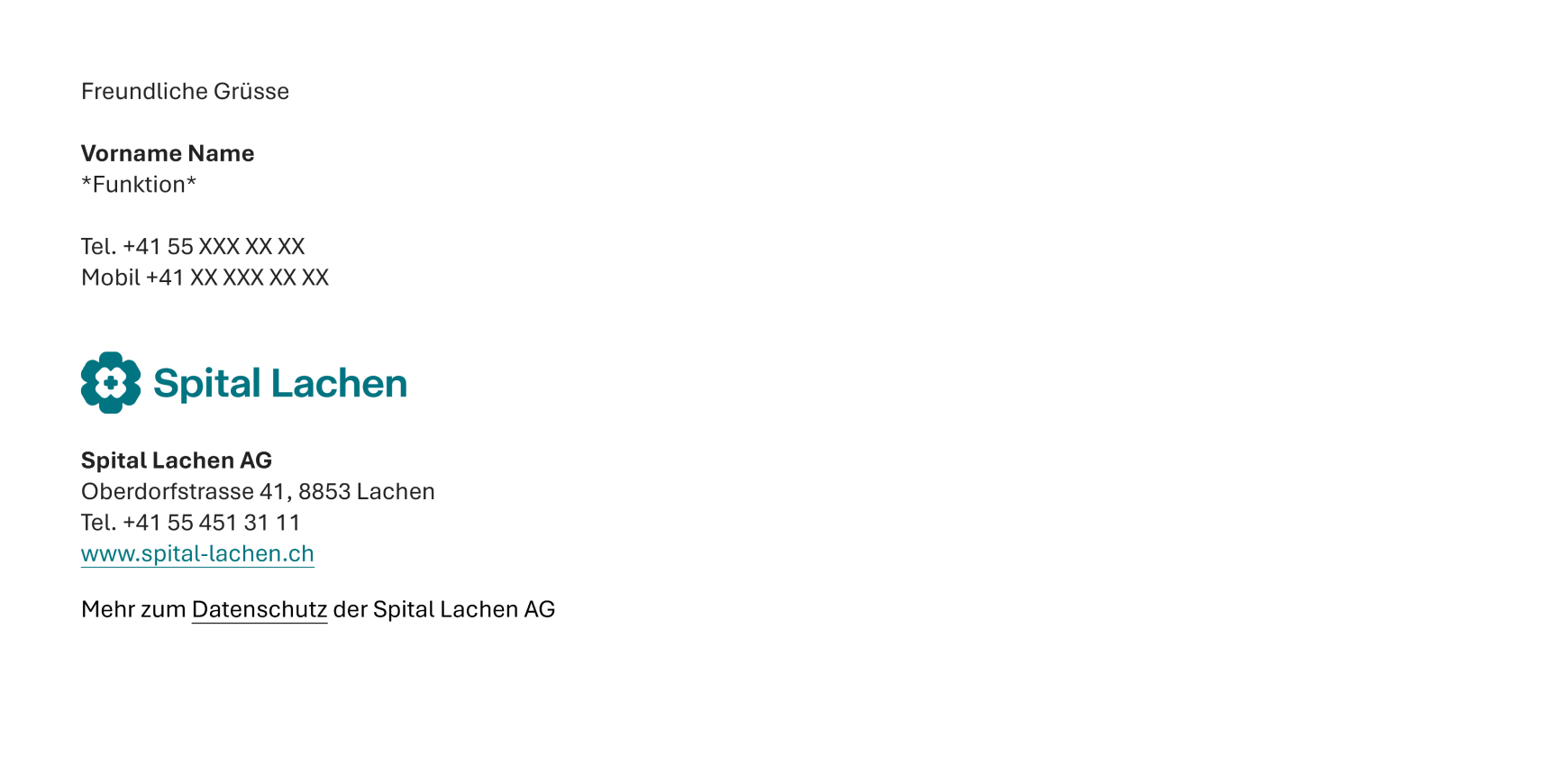 Die E-Mail-Signatur muss persönlich angepassten werden und kann anschliessend direkt aus dem Word ins Outlook, unter Einstellungen bei Signatur hineinkopiert werden. Das Aufführen einer Mobilnummer ist optional und kann selbst bestimmt werden.